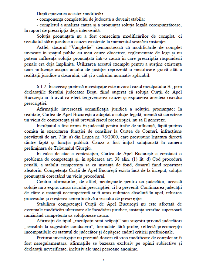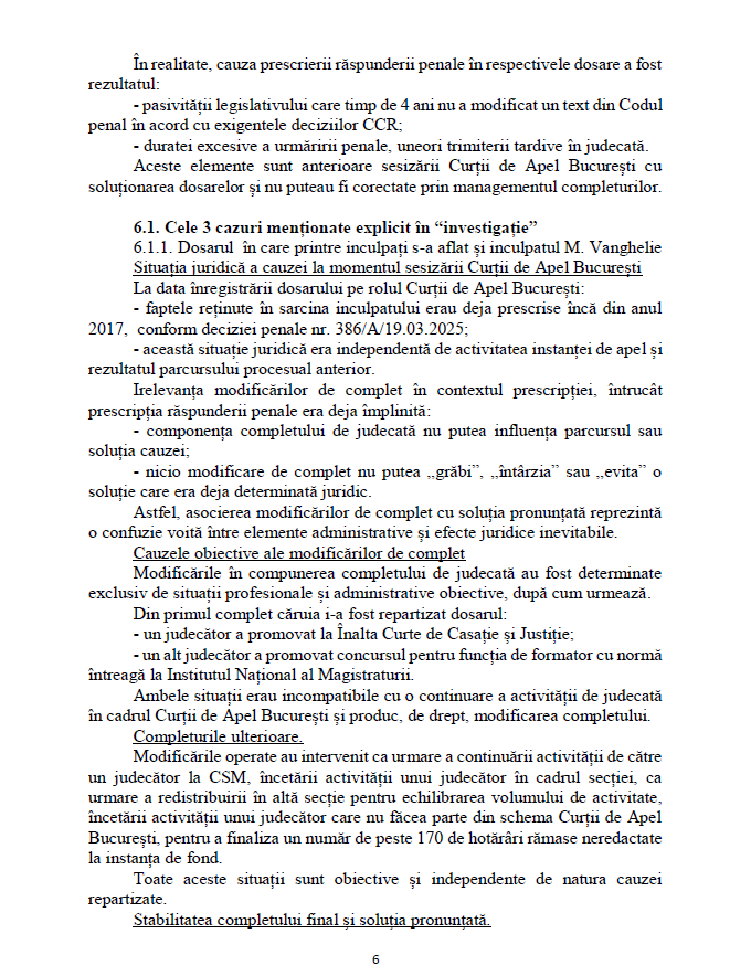 În cazul celorlalte dosare, prescripția era „iminentă”, situație în care „componența completului nu putea influența soluția impusă de lege”.