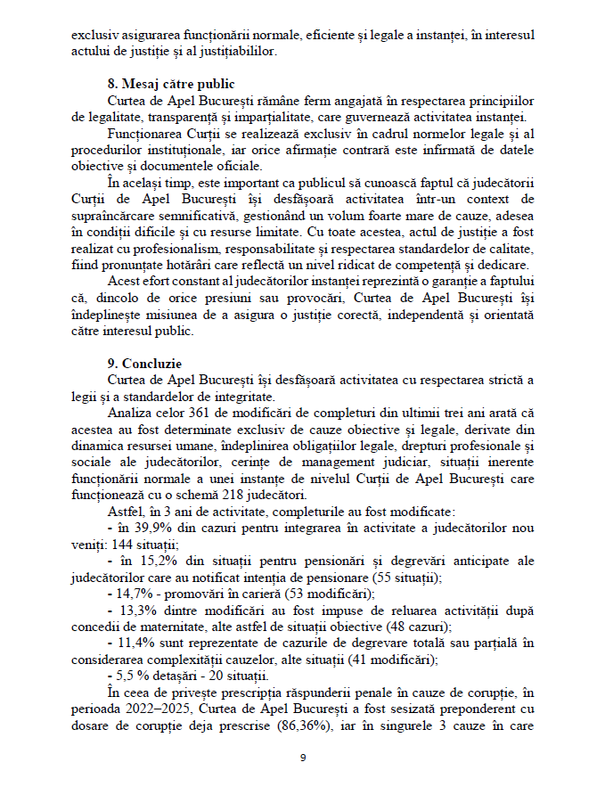 În concluzie, Curtea reia ideea că analiza pe trei ani arată cauze obiective ale modificărilor de completuri și că, în privința dosarelor de corupție din 2022–2025, CAB a fost sesizată „preponderent” cu cauze deja prescrise, iar în cele trei dosare unde prescripția a intervenit ulterior, intervalele de „9 zile, 3 luni și 5 luni” ar exclude responsabilitatea instanței.