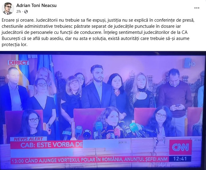 Printr-o postare pe Facebook, Adrian Toni Neacșu, fost judecător al Consiliului Superior al Magistraturii, a criticat modul în care s-a desfășurat conferința de presă de la Curtea de Apel București, în urma documentarului publicat de Recorder.