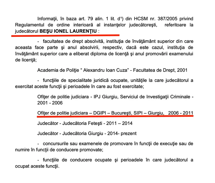 Potrivit portalului justiției, judecătorul Laurențiu Beșu a fost în trecut ofițer de poliție judiciară și a activat în serviciul secret al Ministerului de Interne – DGIPI.