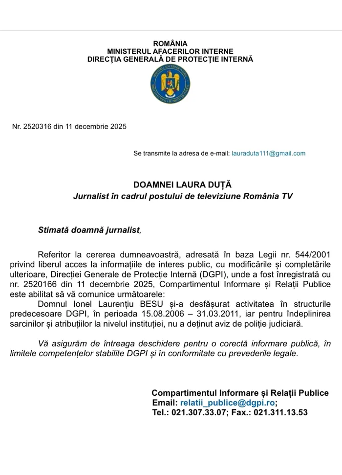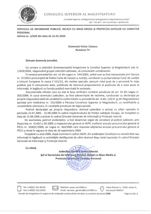 Începând cu anul 2006, după numirea în cadrul DGIPI, din evidenţele Consiliului nu rezultă date sau informaţii în legătură cu activităţile desfăşurate de către domnul Beşu lonel Laurenţiu în cadrul Direcţiei Generale de Informaţii şi Protecţie internă”, transmite CSM.