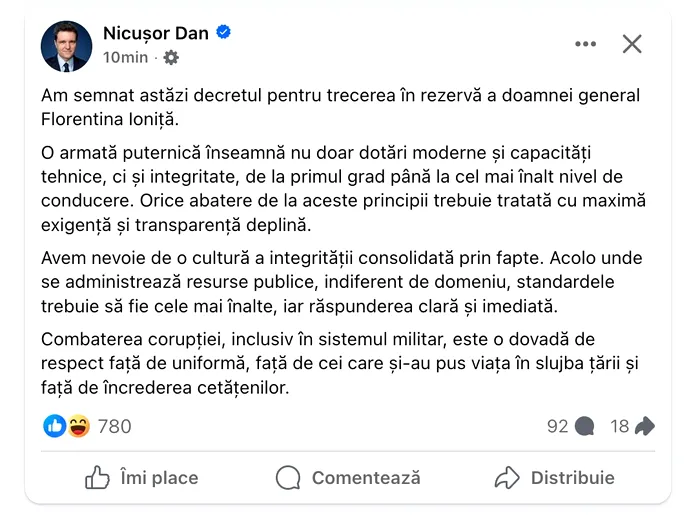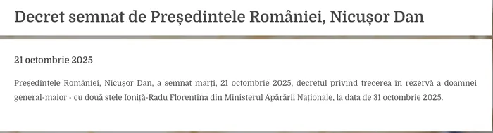 După 5 zile de la ancheta DNA, Președintele României, Nicușor Dan, a semnat decretul pentru trecerea în rezervă a generalului Florentina Ioniță, fosta șefă a Spitalului Militar.