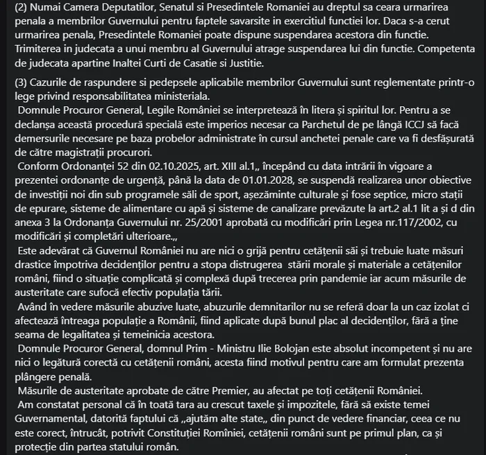 Fostul magistrat face trimitere și la Ordonanța 52/2025, arătând că suspendarea unor investiții locale până în 2028 afectează comunitățile. El susține că „măsurile de austeritate aprobate de către Premier au afectat pe toți cetățenii României” și că deciziile ar fi fost luate „după bunul plac al decidenților, fără a ține seama de legalitatea și temeinicia acestora”.