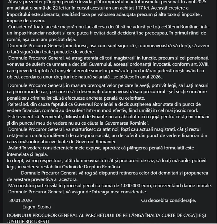 Fostul procuror Eugen Stoina, din cadrul Parchetului de pe lângă Judecătoria Sibiu, a anunțat pe Facebook că a depus plângere penală împotriva premierului Ilie Bolojan și a ministrului Finanțelor, Alexandru Nazare. Într-o postare pe Facebook, Stoina precizează că sesizarea a fost înregistrată la 30 ianuarie și este adresată Procurorului General, Alex Florența.