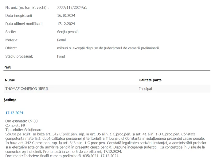 „În baza art. 342 C.proc.pen. rap. la art. 35 alin. 1 C.proc.pen. şi art. 41 alin. 1-3 C.proc.pen. Constată competenţa materială, după calitatea persoanei şi teritorială a Tribunalului Constanţa în soluţionarea prezentei cauze penale. În baza art. 342 C.proc.pen. rap. la art. 346 alin. 1 C.proc.pen. Constată legalitatea sesizării instanţei, a administrării probelor şi a efectuării actelor de urmărire penală în prezenta cauză penală. Dispune începerea judecăţii. Cu contestaţie în 3 zile de la comunicarea încheierii. Pronunţată în cameră de consiliu azi, 17.12.2024.”, se arată în decizia Tribunalului Constanța.
