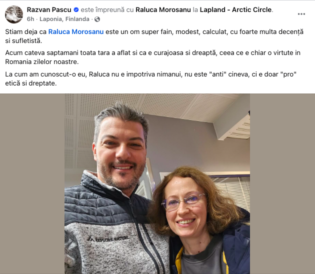 „Știam deja că Raluca Moroșanu este un om super fain, modest, calculat, cu foarte multă decență și sufletistă. Acum câteva săptămâni toată țara a aflat și că e curajoasă și dreaptă, ceea ce e chiar o virtute în România zilelor noastre. La cum am cunoscut-o eu, Raluca nu e împotriva nimănui, nu este anti cineva, ci este doar pro etică și dreptate”, scrie Pascu.