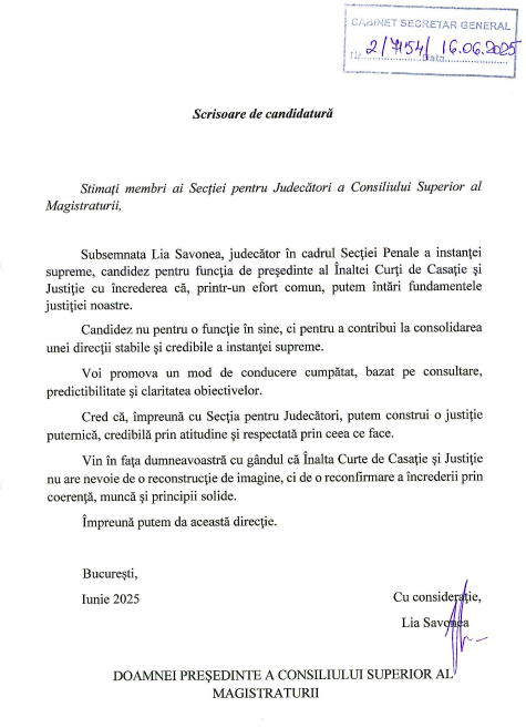 Scrisoarea de candidatură a Liei Savonea conține 44 de pagini și poate fi consultată în întregime aici.