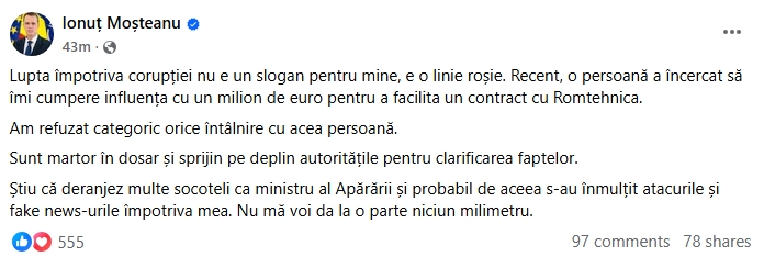 Ministrul Apărării, Ionuţ Mosteanu, a transmis, după arestarea lui Marius Isăilă, fost senator PSD, care ar fi încercat să-i cumpere influenţa cu un milion de euro pentru a facilita un contract cu Romtehnica, că este martor în dosar. Fostul senator PSD a devenit celebru în dosarul în care DNA a descoperit că purta discuții conspirate în toaletele Parlamentului și avea relații cu o fostă conducere DIPI.
