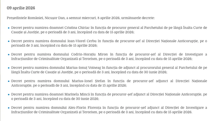 În fruntea Ministerului Public ajunge Cristina Chiriac, numită procuror general, în timp ce la DNA va conduce Ioan-Viorel Cerbu, iar DIICOT va fi preluat de Codrin-Horațiu Miron. Alături de ei au fost numiți și mai mulți adjuncți, completând noua structură de conducere a marilor parchete.