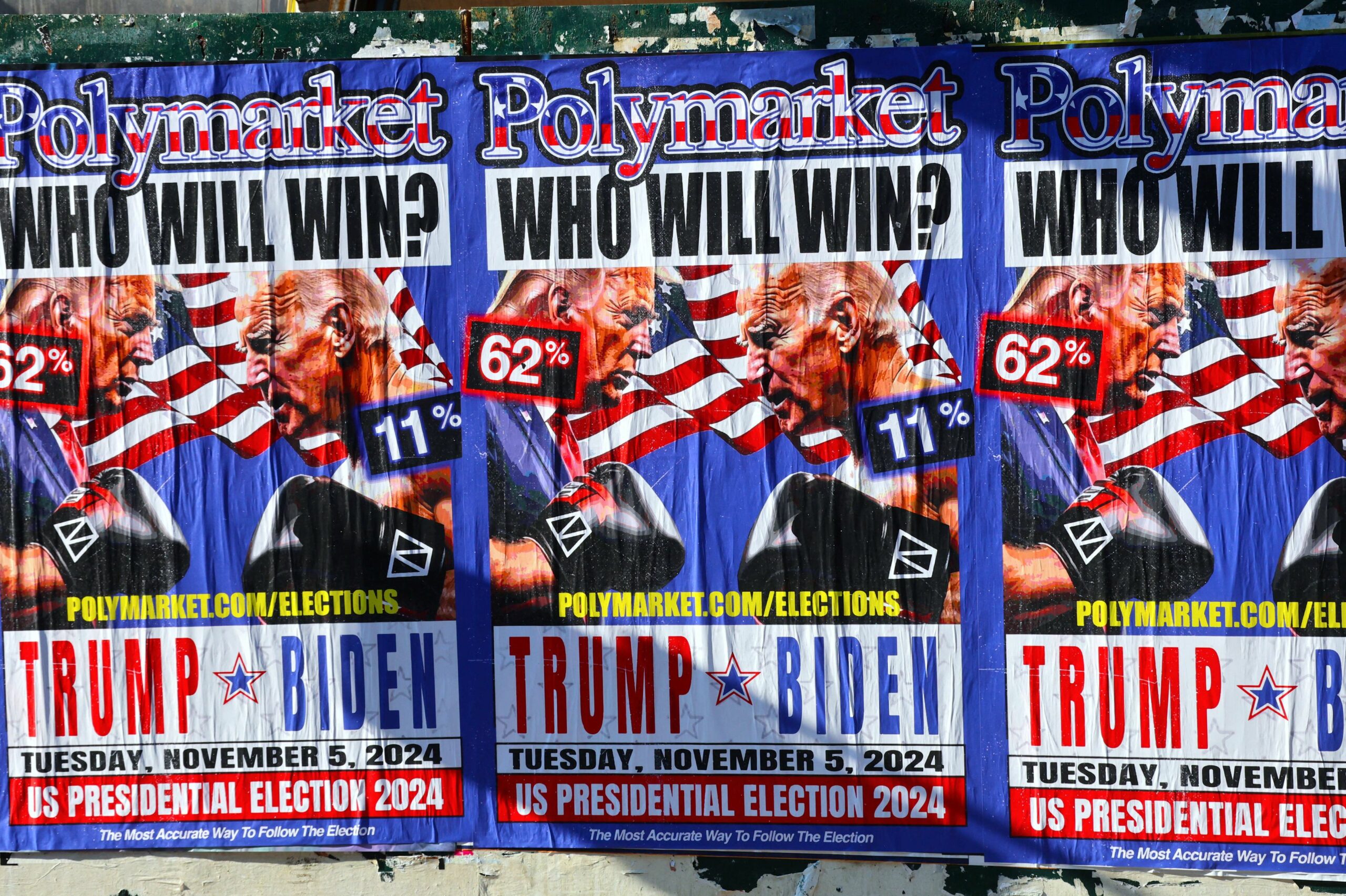 Joe Biden VS Donald Trump billboard on the street by Polymarket, world’s largest prediction market in The Little Italy in New York on July 15, 2024. Photo by Charles Guerin/ABACAPRESS.COM