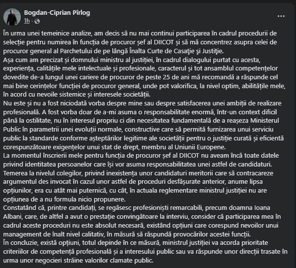 Procurorul militar Bogdan Pîrlog a anunțat pe social-media că se retrage din procedura de selecție pentru funcția de procuror-șef al Direcției de Investigare a Infracțiunilor de Criminalitate Organizată și Terorism (DIICOT). Acesta a precizat că rămâne în cursa pentru funcția de procuror general al Parchetului de pe lângă Înalta Curte de Casație și Justiție din cadrul Ministerului Public.