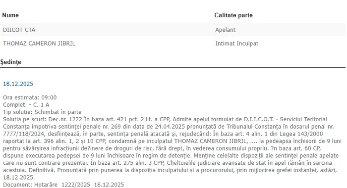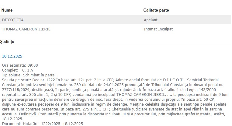 „Dec.nr. 1222 În baza art. 421 pct. 2 lit. a CPP, Admite apelul formulat de D.I.I.C.O.T. – Serviciul Teritorial Constanţa (…) condamnă pe inculpatul THOMAZ CAMERON JIBRIL, …. la pedeapsa închisorii de 9 luni pentru săvârşirea infracţiunii deținere de droguri de risc, fără drept, în vederea consumului propriu. în baza art. 60 CP, dispune executarea pedepsei de 9 luni închisoare în regim de detenţie. (…) Cheltuielile judiciare avansate de stat în apel rămân în sarcina acestuia. Definitivă. Pronunţată prin punerea la dispoziţia inculpatului şi a procurorului, prin mijlocirea grefei instanţei, astăzi, 18.12.2025.)“, se arată hotărârea Curții de Apel Constanța.