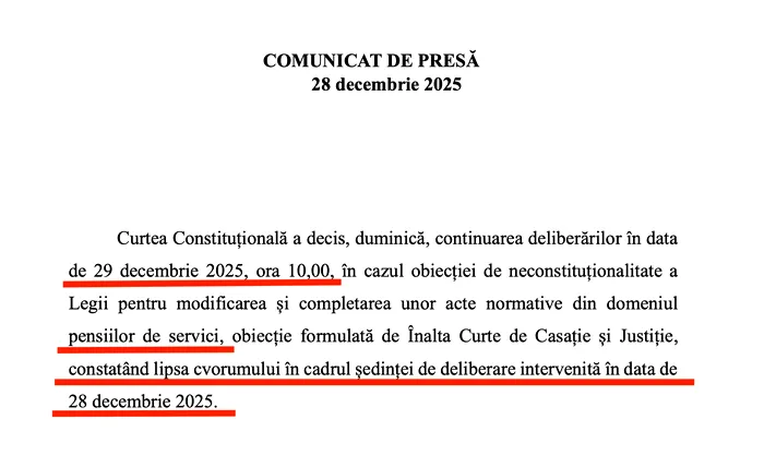 ȘTIREA INIȚIALĂ. Judecătorii CCR nu au dat încă un verdict pe modificările adoptate în Parlament, care vizează creșterea vârstei de pensionare și schimbarea modului de calcul al pensiilor de serviciu pentru judecători și procurori. Motivul amânării ședinței este lipsa de cvorum.