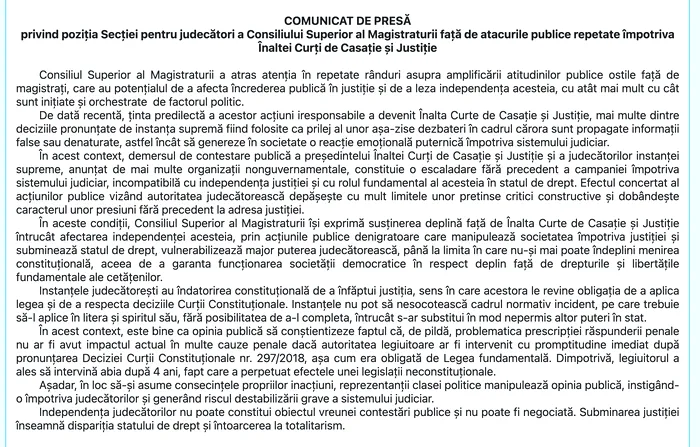 „Consiliul Superior al Magistraturii a atras atenția în repetate rânduri asupra amplificării atitudinilor publice ostile față de magistrați, care au potențialul de a afecta încrederea publică în justiție și de a leza independența acesteia, cu atât mai mult cu cât sunt inițiate și orchestrate  de factorul politic.