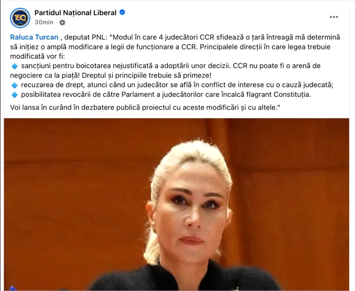 Deputata PNL Raluca Turcan anunță că va iniția un proiect prin care să fie modificată legea de funcționare a Curții Constituționale a României, după ce a treia ședință a CCR care trebuia să decidă soarta pensiilor speciale ale magistraților a fost amânată.