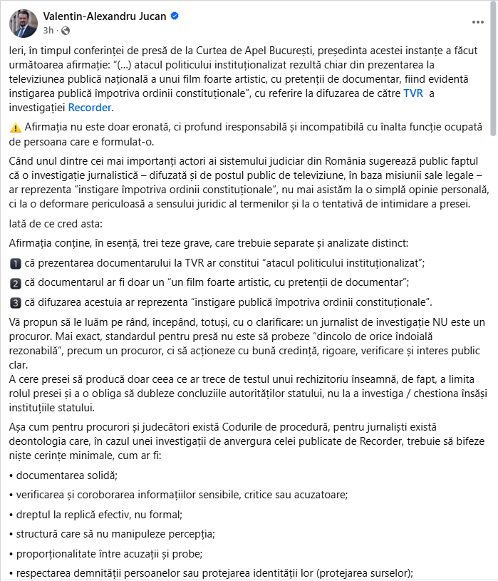 „Afirmația nu este doar eronată, ci profund iresponsabilă și incompatibilă cu înalta funcție ocupată de persoana care e formulat-o. Când unul dintre cei mai importanți actori ai sistemului judiciar din România sugerează public faptul că o investigație jurnalistică – difuzată și de postul public de televiziune, în baza misiunii sale legale – ar reprezenta ”instigare împotriva ordinii constituționale”, nu mai asistăm la o simplă opinie personală, ci la o deformare periculoasă a sensului juridic al termenilor și la o tentativă de intimidare a presei.”, a scris vicepreședintele CNA pe Facebook.