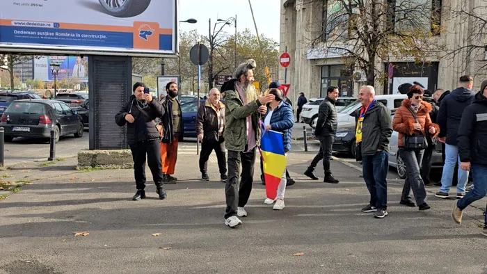 UPDATE ORA 12.45: În fața Curții de Apel a ajuns și Stegarul dac (Cezar Avrămuță), întâmpinat cu căldură de susținătorii lui Georgescu. Recent eliberat din Penitenciarul Giurgiu, acesta a venit fără accesoriul care l-a făcut celebru, imensul drapel tricolor.