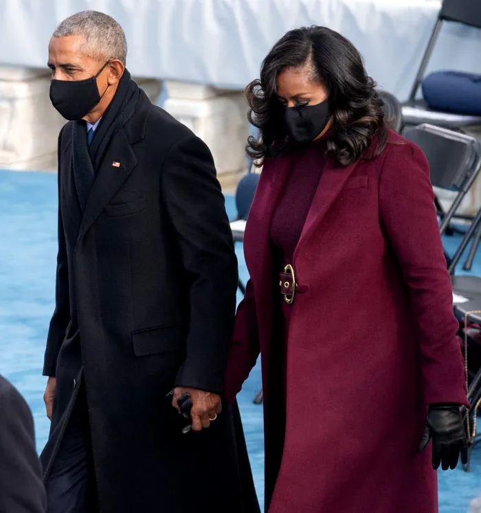 În aceeași linie cromatică s-a situat și Michelle Obama, care a ales pentru Ceremonia de la Capitoliu un costum într-o nuanță de mov prună, de la Segio Hudson. Fosta Primă Doamnă a Statelor Unite a mers pe aceeași eleganță monocoromă, cu o maletă, pantaloni largi și palton în aceeași culoare. Ținuta a fost inspirată dintr-un outfit de podium din ultima colecție a designerului din Los Angeles.