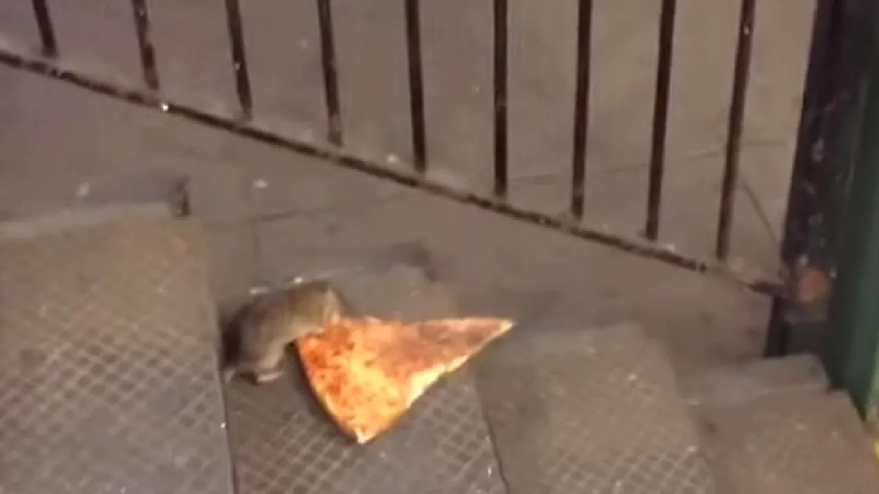 Un șobolan dă peste o felie de pizza pe scările unei stații de metrou din New York. Animalul a fost filmat în timp ce se străduia să transporte „captura".