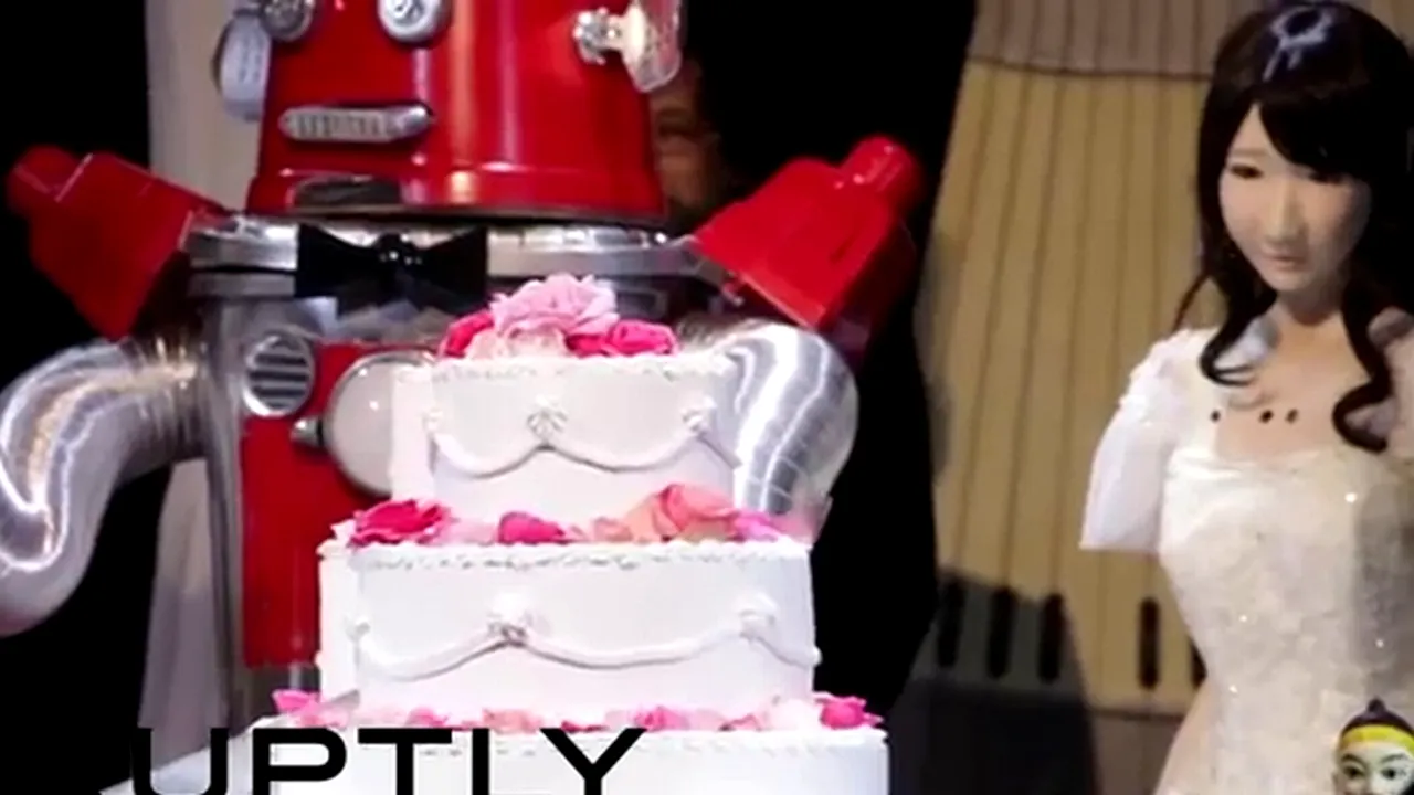 Numeroși spectatori s-au adunat sâmbătă pentru a-i urmări pe cei doi roboți mergând cu pași mici în fața unui altar improvizat în restaurantul Aoyama Cay din centrul orașului Tokyo. Spectatorii au trebuit să plătească însă o taxă de 81 de dolari pentru a putea să asiste la această „uniune sfântă”.