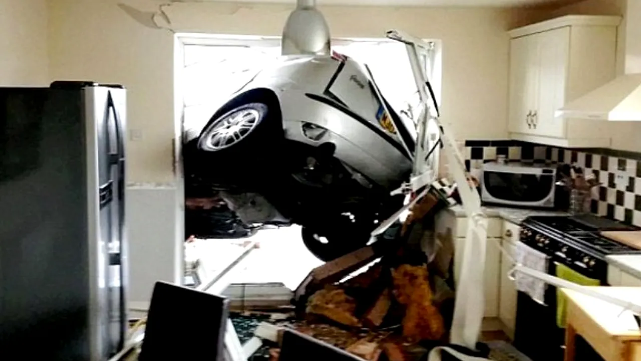 Un șofer a pierdut controlul autovehiculului în care se afla și a intrat, cu spatele, într-o casă, doborând o parte din zidul bucărăriei, scrie Mail Online.