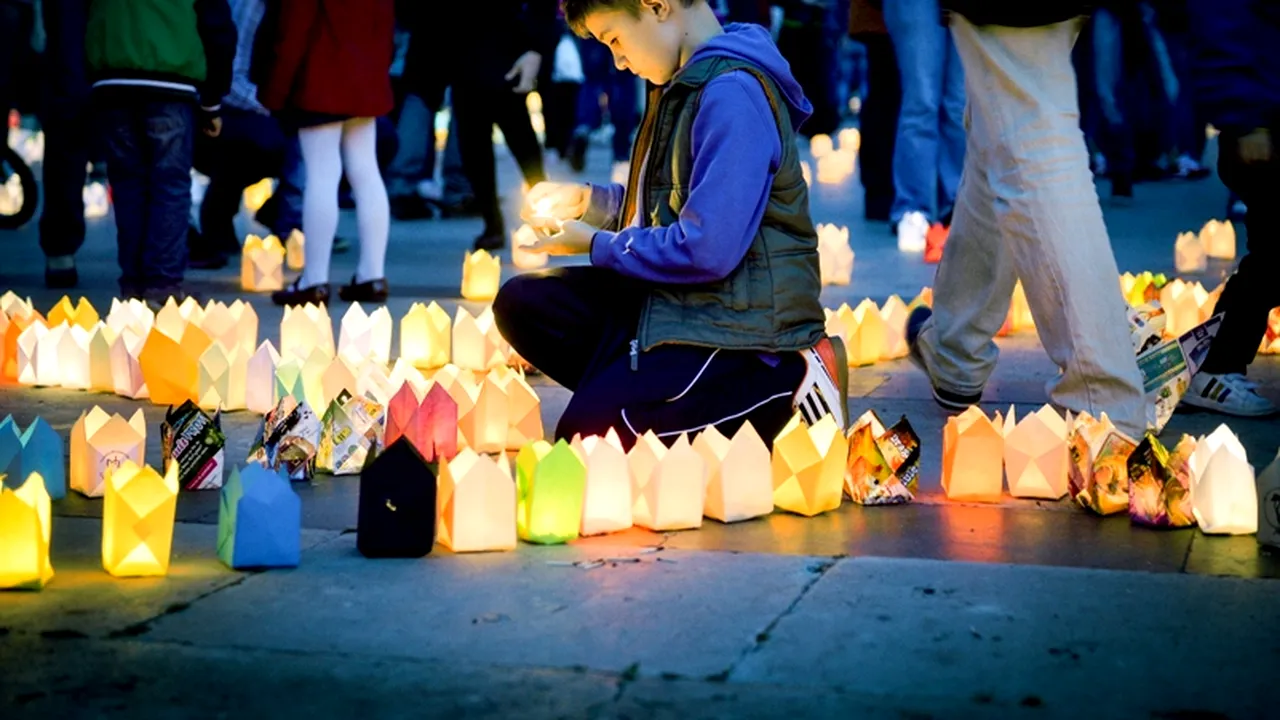 După lasarea întunericului, expoziția „Lumină pentru România” va fi iluminată de o instalație realizată din becuri opaiț și felinare.