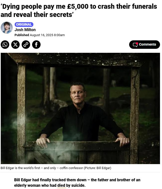 „Bărbatul din sicriu are ceva să vă spună”, le-a zis Bill celor îndurerați, adunați la înmormântarea celui de mai sus. Apoi a citit detaliile din mesajul celui mort, despre o serie de infidelități.