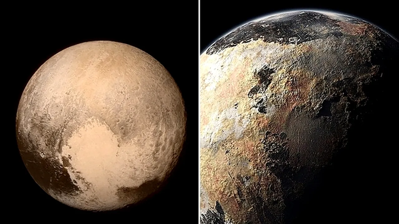 În această primă imagine de mare rezoluție trimisă de sonda New Horizons pe Pământ, se observă reliferul de pe Pluto: apă în formă solidă (gheață), munți de 3.350 de metri înălțime, care cel mai probabil s-au format acum 100 de milioane de ani (fiind ”tineri” raportați la vârsta Sistemului nostru solar – 4,5 miliarde de ani)