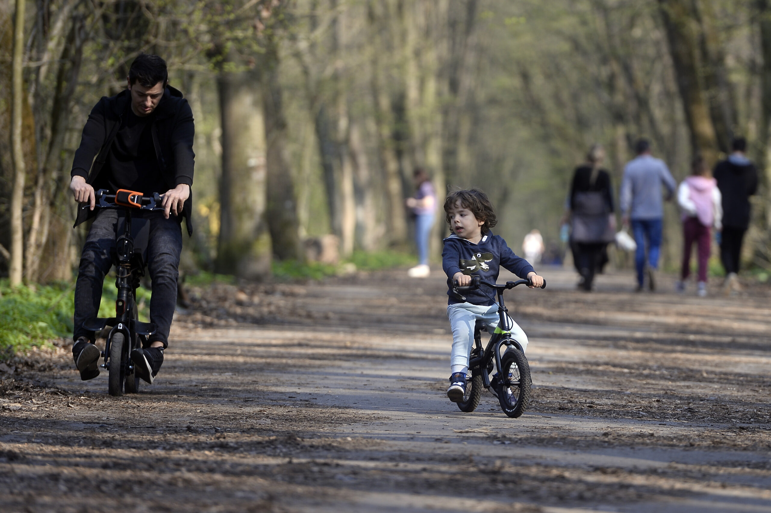 Un barbat impreuna cu fiul sau, se plimba pe biciclete, sambata, 21 martie 2020, in padurea Baneasa. Zeci de bucuresteni au iesit sambata, in contextul pandemiei de coronavirus, cu masinile la Padurea Baneasa, aflata langa Bucuresti. EDUARD VINATORU / MEDIAFAX FOTO