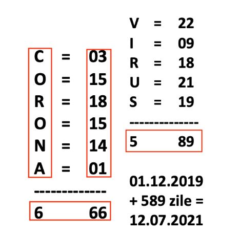 Dacă fiecărei litere se atribuie valoarea numerică (A=1, B=2, C=3… etc.) atunci suma aritmetică a tuturor literelor din Corona este de 66 și cu 6 din numărul de litere al „coronei” se obtine 666, numarul Diavolului. Despre numărul Diavolului este scris in Biblie: „Şi ea (fiara) îi sileşte pe toţi, pe cei mici şi pe cei mari, şi pe cei bogaţi şi pe cei săraci, şi pe cei slobozi şi pe cei robi, ca să-şi pună semn pe mâna lor cea dreaptă sau pe frunte. Încât nimeni să nu poată cumpăra sau vinde, decât numai cel ce are semnul, adică numele fiarei, sau numărul numelui fiarei. Aici este înţelepciunea. Cine are pricepere să socotească numărul fiarei; căci este număr de om. Şi numărul ei este şase sute şaizeci şi şase.” Trebuie spus aici ca deja a aprut ideea ca persoanele sanatoase, cele care nu au contactat virusul, sau cele care s-au insanatosit, sa poarte o „stampila” temporara pe mana sau pe frunte, ca sa fie lesne de identificat fata de cei contaminat., potrivit Ziua News.