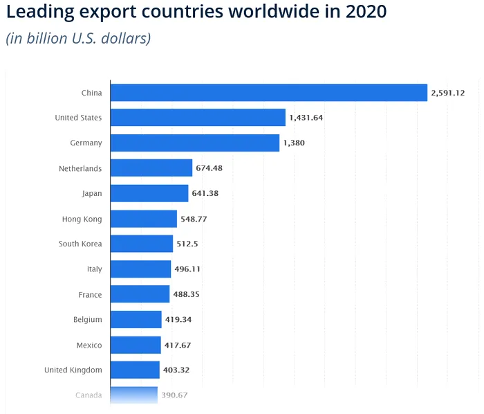 Secolul chinezesc a început cu o Chină campioană a comerțului global. În anul 2020, China a fost cel mai mare exportator al lumii, cu 2591 de miliarde de dolari, adică aproape dublu față de Statele Unite (1 431 de miliarde de dolari):