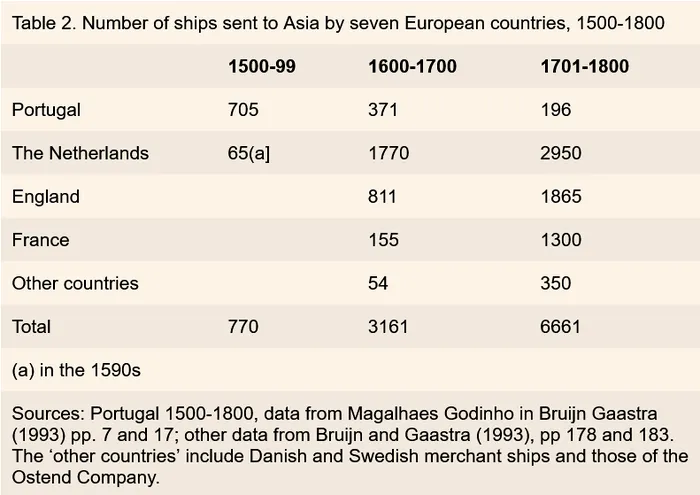 Piața pe care intrau europenii în Asia era imensă, populația asiatică fiind, în vremea lui da Gama, de cinci ori mai mare decât cea europeană. India singură avea o populație dublă față de cea a Europei de Vest. Expedițiile comerciale maritime ale portughezilor, olandezilor, englezilor și francezilor au dus la dominarea comercială a Asiei de către europeni și au culminat cu ocupația militară a sudului continentului de către puterile bătrânului continent.