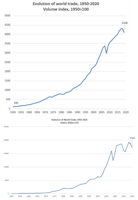 Și pentru a înțelege cât de mare este forța chinezilor în evoluția comerțului internațional, dacă între 1500 și 1800 acesta creștea cu 1% pe an, între 1950 și 2020, comerțul global a crescut cu 4-5% în fiecare an, adică de cinci ori mai rapid ca acum 500 de ani. Din 1950 până în 2020, comerțul internațional a crescut de 40 ori în volum și de 274 de ori în valoare: