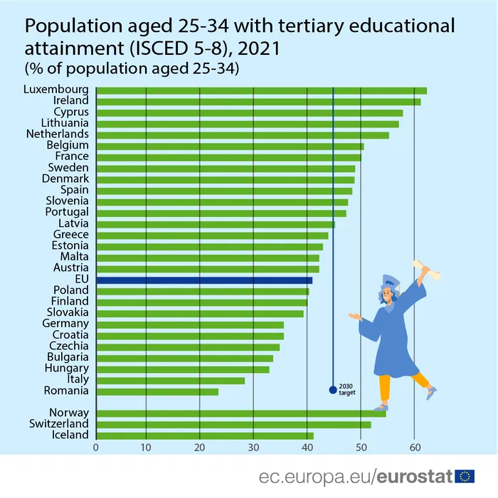 Dar nici cei care rămân în școală nu au mari performanțe, căci reușim ridicolul record de a fi și ultimii din Uniune la ponderea absolvenților de universități (așa-numitele studii terțiare): la noi doar 24% dintre copiii unei generații termină o facultate, aproape la jumătate față de media europeană, care este de 41%.