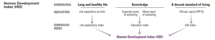 Din acest punct de vedere, probabil cel mai cuprinzător indicator este „indicele dezvoltării umane” (The Human Development Index – HDI), un indicator compozit care măsoară nivelurile atinse pentru trei dimensiuni cheie ale vieții omenești: o viață lungă și sănătoasă, cunoștințele acumulate și standardul de viață. HDI este media geometrică a indicilor normalizați corespunzători celor trei dimensiuni. Dimensiunea „sănătate” se exprimă prin speranța de viață la naștere, dimensiunea „educație” prin numărul anilor de școală pe care îi va face un copil care intră astăzi în școală, iar dimensiunea „standardului de viață” prin venitul național brut pe locuitor.