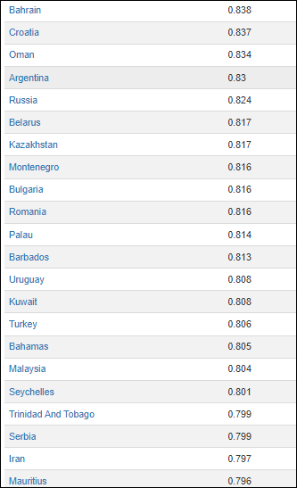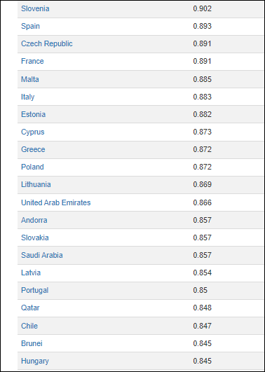 România se găsește abia pe locul 54 la nivel global, cu o valoare de 0,816, după Bulgaria (locul 53 , tot 0,816), după Rusia (locul 49-0,824) și Belarus (locul 50-0,817). Croația este pe locul 46, Ungaria pe 44 (0,845), Slovacia pe 37 (0,857), Polonia pe 33 (0,872), la egalitate cu Grecia.