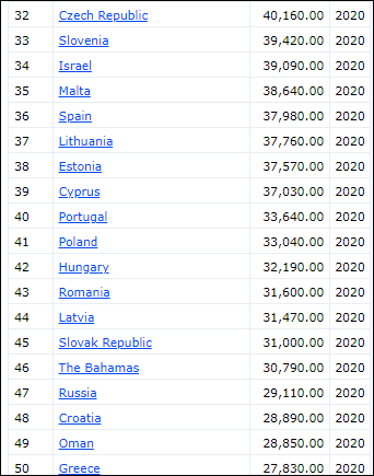 Iată, mai jos, partea de clasamentul mondial care include statele din Estul Europei, cu Cehia la peste 40 000 USD/locuitor, Polonia la 33 000 USD/locuitor, Ungaria la 32 000 USD/locuitor și România cu peste 31 000 USD/locuitor. Bulgaria, cu 24 000 USD/locuitor este abia pe locul 58 pe glob:
