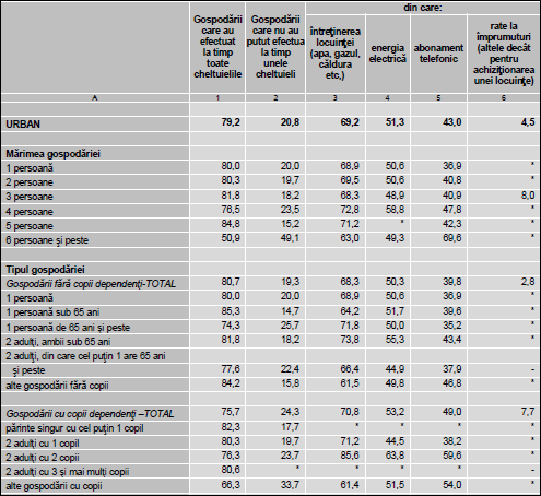 21% dintre gospodăriile din mediul urban nu au putut să plătească la timp diverse cheltuieli. 70% dintre acestea, adică peste 14% dintre gospodării (una din șapte) nu și-au achitat la timp plata facturilor la apă, gaze, electricitate sau încălzire: