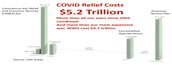 Ca să înțelegem dimensiunea uriașă a ceea ce s-a întâmplat, ar trebui să conștientizăm că America, cea mai mare și mai influentă economie a planetei, a cheltuit pentru combaterea efectelor economice ale COVID-19 o sumă de bani mai mare decât costul cumulat al tuturor războaielor purtate de SUA în acest secol: