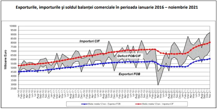 Cât privește deficitul comerțului exterior cu bunuri, acesta a depășit 21 miliarde de euro până în noiembrie și a depășit, probabil, 25 miliarde de euro la sfârșitul anului 2021, într-o creștere necontenită în ultimii ani: