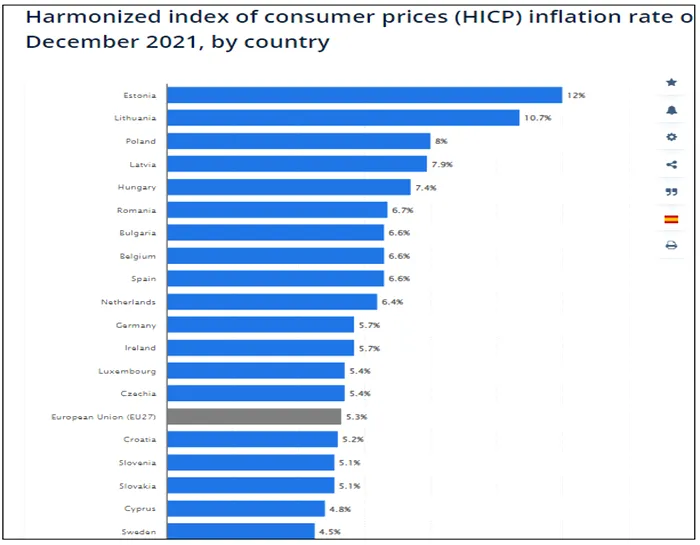 Dacă ne raportăm la un alt indicator european al inflației, indicele armonizat al prețurilor de consum, cele mai ridicate niveluri ale creșterii prețurilor le găsim în Estonia (12,7%), Lituania (10,7%), Polonia (8%), Letonia (7,9%), Ungaria (7,4%) și România (6,7%). Nici chiar Germania nu stă prea bine cu 5,7%.