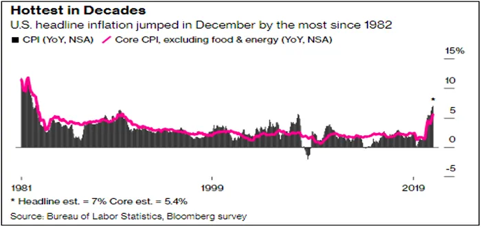 În Statele Unite, inflația (indicele prețurilor de consum) a ajuns la 7%, un nivel nemaiatins din 1982, atunci când Reagan a venit la putere pentru a desumfla cel mai mare puseu inflaționist din istoria modernă federală: