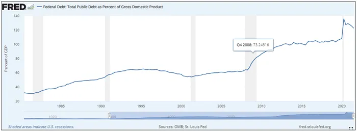 Prin 2020, ponderea datoriei publice americane în PIB a atins maximul: 136%, nivel nemaiîntâlnit până atunci. Așa, spre comparație, la sfârșitul crizei precedente, în 2013, datoria publică a SUA abia atingea 100% din PIB: