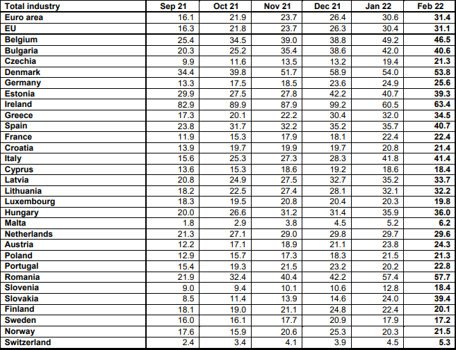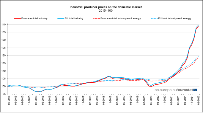 Ei bine, da, întreaga uniune Europeană se află sub asediul ratelor mari ale inflației (ale creșterilor prețurilor). Inflație datorată creșterii prețurilor industriale (la poarta fabricii). adică inflația „industrială” se transmite către rafturile de unde ne facem noi cumpărăturile. Numai în luna februarie, înainte de începerea invaziei din Ucraina, prețurile industriale (pe care consumatorii le resimt în prețurile la raft peste 3-6 luni)au crescut cu mai bine de 1 procent față de ianuarie.