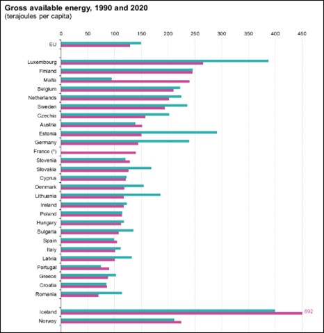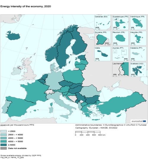Și dacă tot avem la dispoziție cea mai mică cantitate de energie dintre toți europenii, cam atât și consumăm. Suntem, cum s-ar spune, printre campionii eficienței energetice continentale, având printre cele mai scăzute intensități energetice din Uniune, adică ne trebuie o mult mai mică cantitate de energie pentru a produce 1000 de euro de PIB decât au nevoie ceilalți europeni: