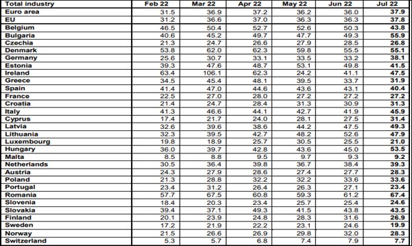 Până la urmă, veți zice, și ce dacă avem cea mai puțină energie disponibilă pe locuitor din Uniune? Cu ce ne afectează asta? Ei bine, iată la ce s-a ajuns în mijlocul unei crize energetice majore pe care întreaga Europă o traversează astăzi: pe scurt, Europa nu produce suficientă energie cât să-și acopere consumul și se află în „război rece” cu principalul furnizor de resurse energetice, deci avem un deficit major de energie primară. Insuficiența mărfurilor in piață împinge prețurile cât mai sus. Numai că acolo unde este cel mai mare deficit de resurse, fix acolo prețurile vor crește mai mult. Și, în ciuda guvernanților cu mintea prea simplă, țara cu cea mai mică cantitate de energie disponibilă este și țara în care prețurile mărfurilor produse cu acea energie au cea mai mare creștere. Simplu spus, insuficiența resursei energetice la noi a provocat cea mai mare scumpire din UE a produselor industriale, adică avem cea mai mare inflație industrială în ultimele 12 luni, din întreaga Uniune: