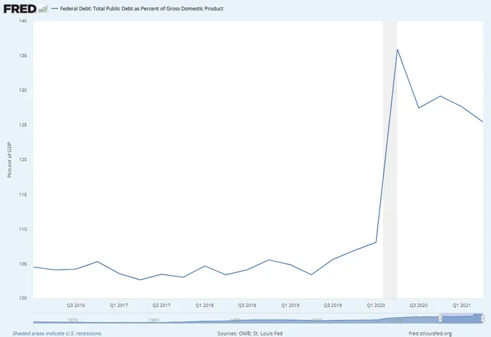 Iată cum arată ponderea datoriei publice în PIB-ul american: o scădere de la 136% la sfârșitul anului trecut la doar 125,45% la sfârșit de iunie 2021. Asta deși datoria nominală tot 28.500 miliarde de dolari a rămas.