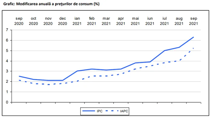 Rata inflaţiei de la începutul anului (septembrie 2021 comparativ cu decembrie 2020) este 5,6%. Rata anuală a inflaţiei în luna septembrie 2021 comparativ cu luna septembrie 2020 este 6,3%.