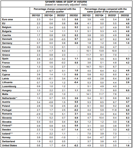 Să vedem acum modul în care a performat economia Uniunii Europene în acest interval de timp. Ei bine, Uniunea Europeană a crescut econmic și în trimestrul II al acestui an, cu 0,6% în medie. Nici prețurile uriașe la țiței și combustibili, nici incertitudinile privind aprovizionarea cu gaze naturale la iarnă, nici reducerea comerțului cu rușii, nimic nu a lovit decisiv economia europeană.