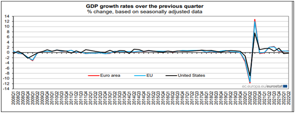 Hai să vedem, pentru început, cum a evoluat principale putere economică a lumii, Statele Unite. După o scădere abruptă cu 3,4% în anul pandemiei (2020), urmată de o revenire fabuloasă, cu 5,7% în 2021, cea mai importantă economie a lumii a intrat în recesiune, cu două trimestre succesive de contracție: -1,6% în trimestrul I 2022 (față de trimestrul IV 2021) și -0,6% în trimestrul II al anului curent (față de primul trimestru al aceluiași an):